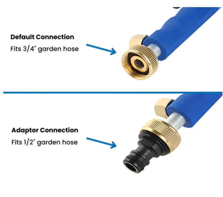 JetFlux‘s Default Connection fits 3/4″ garden hoses for standard use, while the included Adaptor Connection fits 1/2″ garden hoses, providing flexibility and convenience for all your cleaning and watering needs.